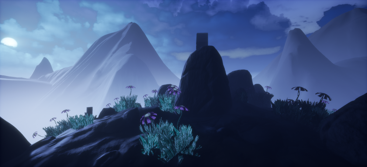 For this week, we were tasked to take the project we've been working on for the past few weeks, and create the final version of the vegetation - specifically, by using the "image on a modified plane" technique that was demonstrated to us. So, that's what I wound up doing, finalizing my proxy plants in the way requested. The goal here was to make the plants fit in with the sort of "northern tundra" feel I've been going for - small clumps of hardy, scrubby grass and flowers, stubbornly clinging to life in the frozen, stony soil, adding little splashes of color to the browns and greys of the tundra. Here are some images of my scene with the new vegetation.